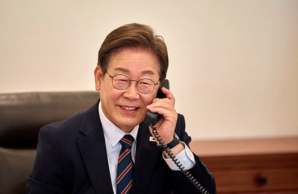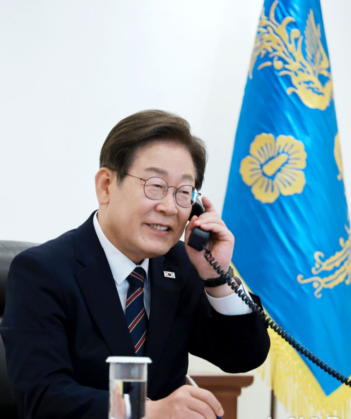 (전화 통화 중 긍정적인 표정을 짓고 있는 이재명 대통령입니다.)