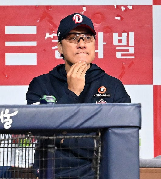 팀의 상징인 'D' 로고가 박힌 유니폼을 착용한 감독의 모습은 두산 베어스의 상징성을 잘 나타냅니다.